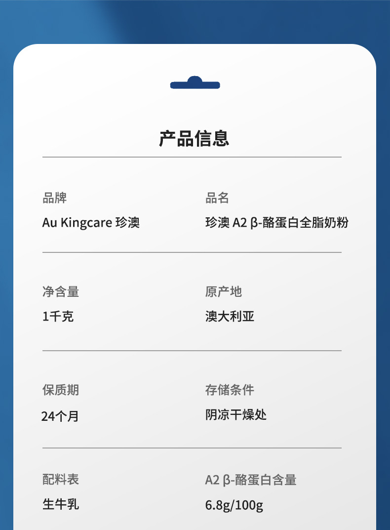 澳大利亚进口 Au Kingcare 珍澳高钙全脂奶粉(袋装)1000克